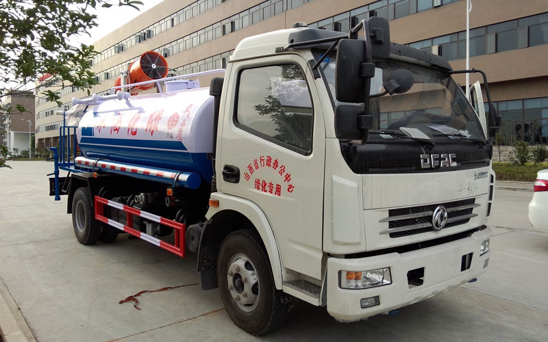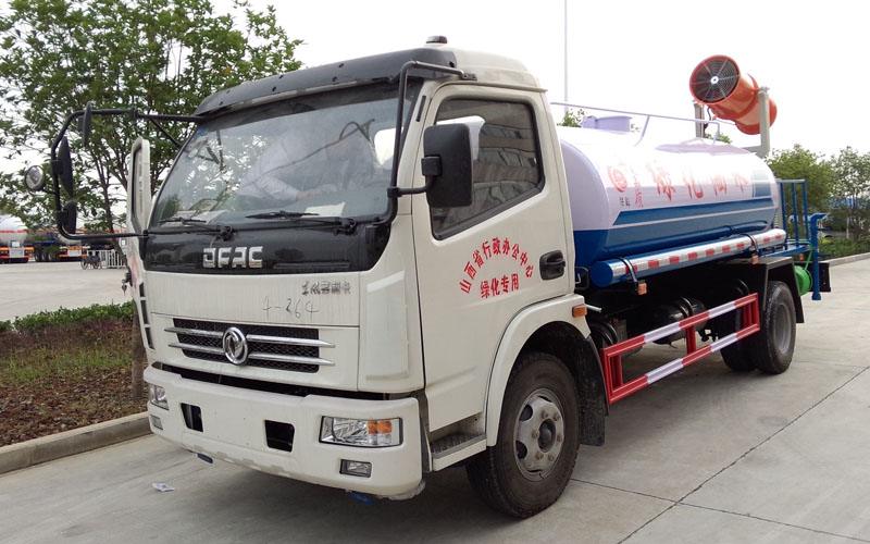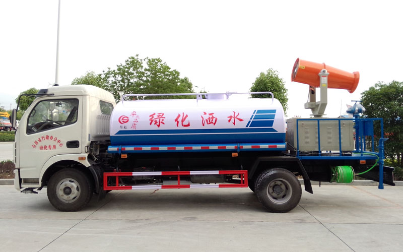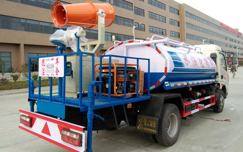 整車具有前沖、后灑、側(cè)噴、后置式工作平臺(帶踏梯,四周有安全護欄)、平臺上設置有高壓水炮(可360°全方位旋轉(zhuǎn),可連續(xù)噴射出:直沖狀、開花狀、雨狀、半霧狀等水流形態(tài)。柱狀水流射程28米,半霧狀射程14米)。平臺上安裝帶獨立動力的炮筒式風送噴霧打藥機組。該車灑水寬度大于14米,配備優(yōu)質(zhì)大功率專用灑水泵、取力器、雜物過濾網(wǎng)、國標通用65型消防接口(可通過消防栓加水)、1套自流球閥系統(tǒng)(可自吸自排,大吸程6米)、2根引水鋼絲膠管(帶陰陽快速接頭)、配鎖、水位計、高音作業(yè)喇叭,兩側(cè)及后加強型保險杠,防滑爬梯,膠管儲存筒。